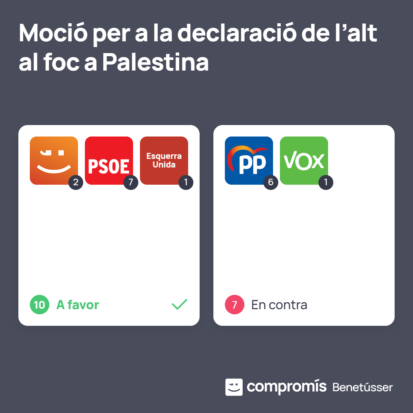 A més, es van presentar mocions per la protecció dels cítrics valencians, per combatre la ludopatia, per l’alt al foc a Palestina, per declarar l’Any Estellés a Benetússer i una proposta de Declaració Institucional pel 8 de Març que finalment no es va fer Declaració Institucional pel vot en contra de Vox.